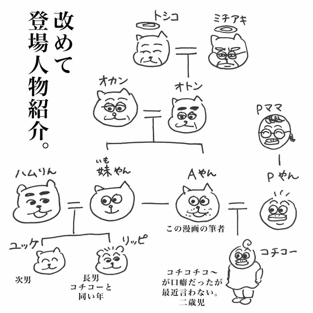この漫画を描き始めた頃はこんなに登場人物いなかったな。めっちゃ増えた😂子どもたちの名前も付けてみました。