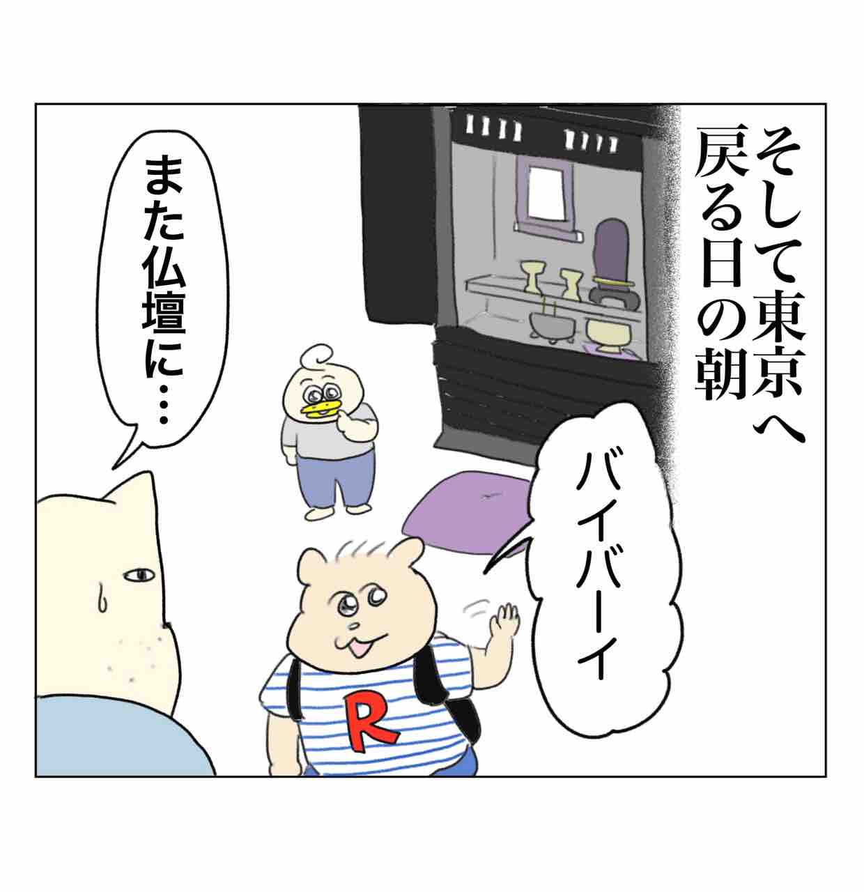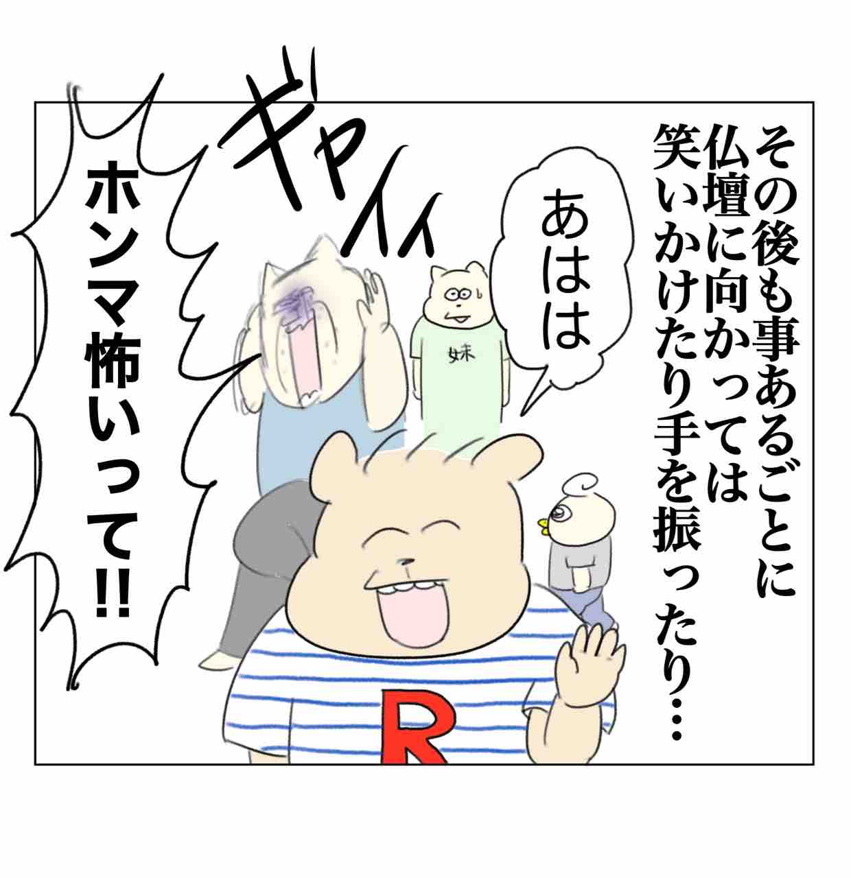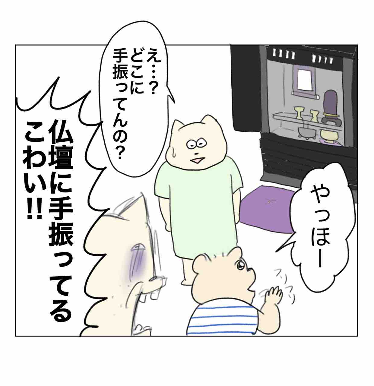 お盆あるある 2024年08月14日 こんばんは🌝今日はパタミたんをシッターさんに見てもらって久々にコチコーとサシで外食してきたワシです。マジでシッターさん偉大。今日の漫画は少し涼しくなる話かもしれません👻※リッピはワシの甥っ子(コチコーのいとこ)ですこれ絵だとあまり伝わらないんですけど、マジで空中に向かって誰かと笑い合ってたり仏壇に向かって何度もバイバイしたりほんっとにビックリした…何か視えてたんかな。ちなみにリッピのみでコチコーは全く何もなかったです。その他の帰省エピソード👇🏻 「コチコー漫画🐥」カテゴリの最新記事 < 前の記事次の記事 > コメント コメント一覧 (8) 1. ふふ 2024年08月14日 18:15 久々のリッピ回✨ もうブリュレしない 0 aandp1989 がしました 4. Aやん 2024年08月15日 12:01 >>1 現在のリッピは『ちん◯ん』とか言ってギャハギャハ笑ってる立派な男子に成長しました笑 0 aandp1989 がしました 2. 相毛安斗新 2024年08月15日 00:55 久々にコメント失礼致します。相毛安斗新です。 今年1月8日に心筋梗塞で突然死した父親に会いに、妹と甥が家に来た後に来ています。 確かに、子どもにとって不思議な世界がある事は今回の甥御さんの姿を見ても明らかであり、たからこそ手を振っていたのだと思います。 しかしながら、それによって喜びの輪が広がる事は何より素晴らしい事であり、それによって敬愛を知る事は疑いありません。 甥に渡そうとアンパンマンペロペロチョコを買ったのに、渡す事すら忘れてしまった44歳倉庫内作業員男性の、いつにも増してくだらないコメントとなってしまいましたが、これからも『Aやんのええやん!ブログ』が家族の絆をつなぐ存在である事を心から願うものです。 🍉 🍉 🍉 🍉 🍉 🍉 🍉 🍉 🍉 🍉 🍉 🍉🍉 🍉 🍉 🍉 🍉 🍈🍈🍈 🍈🍈🍈 🍉 🍉 🍈 🍈 🍈 🍈 🍉 🍉 🍍🍍🍍 🍍🍍🍍 🍉 🍉 🍍🍑🍍 🍍🍑🍍 🍉 🍉 🍍🍍🍍 🍍🍍🍍 🍉 🍉 🍑🍑 🍉 🍉 🍈 🍑🍑 🍈 🍉 🍉 🍈 🍍 🍍 🍈 🍉 🍉 🍈 🍍🍍🍍🍍🍍 🍈 🍉 🍉 🍈 🍈 🍉 🍉 🍉 🍉🍉🍉🍉🍉🍉🍉🍉🍉 下手くそな絵文字ながら、すいかとメロンとパイナップルと桃で父方のお祖母様を描いてみました。 まことに不謹慎な絵文字で申し訳ございません。 0 aandp1989 がしました 5. Aやん 2024年08月15日 12:02 >>2 全然不謹慎じゃないです!毎度うますぎます、ありがとうございます😭✨ 0 aandp1989 がしました 7. いふ 2024年08月15日 16:34 >>2 熱意がすごい! 力作ですね✨ 0 aandp1989 がしました 3. たぬきっち。 2024年08月15日 10:56 うちはお盆に限らず、父の愛用していた書斎に行くと必ず子供達がニコニコしながら手を振ってました。 3兄弟で、必ず各自2歳の時。 いるんか…。ってお仏壇じゃなくて書斎に好物だったジェリービーンズ置いてあります。笑 0 aandp1989 がしました 6. Aやん 2024年08月15日 12:03 >>3 オトン…!!!!確実におるっ…😂 0 aandp1989 がしました 8. いふ 2024年08月15日 16:36 子供のスピリチュアルな部分に遭遇した時、 絶対怖がってしまう😂 0 aandp1989 がしました コメントフォーム 名前 コメント 記事の評価 リセット リセット 顔 星 情報を記憶 コメントを投稿する
