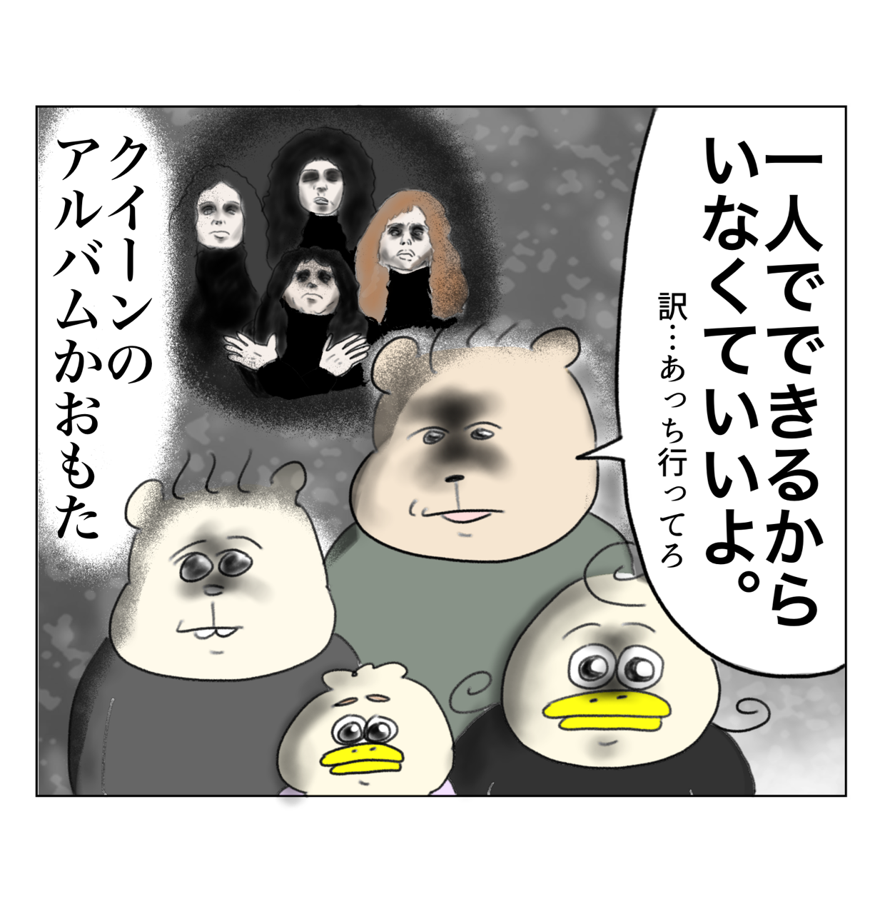全く親戚に懐いてない甥っ子 2025年01月10日 こんばんは🌝幼稚園が始まりましたが気持ちはまだまだ冬休みなワシです。今日の漫画はワシの妹の子、リッピ(5歳)とユッケ(もうすぐ4歳)の久々登場回です!たまたま半数が黒い服着てた上に立ち位置も完璧やった↓これね。リッピ&ユッケ回👇🏻 「日常漫画😸🐤」カテゴリの最新記事 < 前の記事次の記事 > コメント コメント一覧 (8) 1. マコ 2025年01月10日 18:56 脳内で、ボヘミアンラプソディのマンマミーア!の部分が流れてます😂😂 0 aandp1989 がしました 2. Aやん 2025年01月10日 19:08 >>1 マンマミーア派でしたか!🤣 私はガリレオ〜♪が流れました(誰も聞いてない) 0 aandp1989 がしました 3. てんてん 2025年01月10日 19:43 けけけ🤣 ボヘミアン・ラプソディ♪みたいな皆さんになったのね そういえば昼にやってたナンとか占いで (生年月日を全部足し算して最後に残った数字がその人のポジション?らしいやつ) ティーチャーとかチャレンジャーの人とか 部類があったけど私はクイーンでした クイーンとなるとフレディ・マーキュリー… ついそういう変換してしまいました 甥っ子さんスクスク成長してて良かったです コチコーちゃんが漫画の絵でも レイディにめちゃくちゃ見えました✨ 0 aandp1989 がしました 4. おにく 2025年01月10日 20:20 寝かしつけ中なんですが、声出して笑いました。 0 aandp1989 がしました 5. ももこ 2025年01月10日 21:15 声出して笑いました🤣👏👏👏まごうことなきクイーン🤣 0 aandp1989 がしました 6. あーたたん 2025年01月11日 04:53 サイコーです🤣えーやんの発想大好きや 0 aandp1989 がしました 7. ジョルノ 2025年01月11日 11:45 ヴィスミッラ!脳内再生されました😂 0 aandp1989 がしました 8. 最高 2025年01月11日 19:30 ロジャーとフレディ姉妹😂 0 aandp1989 がしました コメントフォーム 名前 コメント 記事の評価 リセット リセット 顔 星 情報を記憶 コメントを投稿する